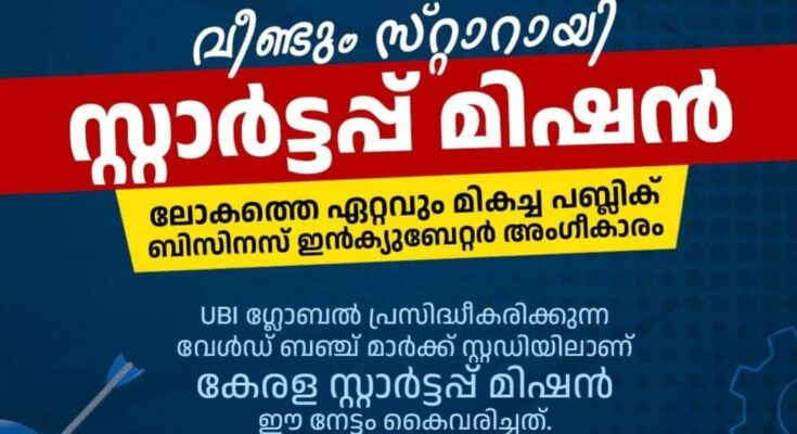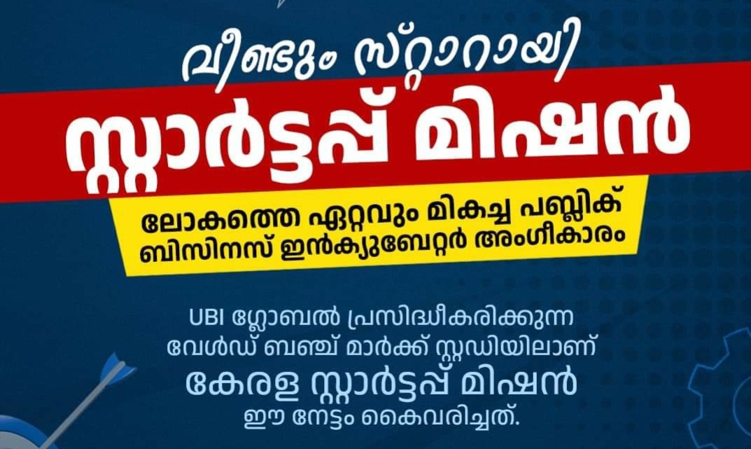 കേരളത്തിന്റെ സ്റ്റാർട്ടപ്പ് മേഖലയ്ക്ക് അന്താരാഷ്ട്ര അംഗീകാരം. ലോകത്തെ ഏറ്റവും മികച്ച പബ്ലിക് ബിസിനസ് ഇൻക്യുബേറ്റർ ആയി കേരള സ്റ്റാർട്ടപ്പ് മിഷൻ തെരഞ്ഞെടുക്കപ്പെട്ടു. ലോകമാകെയുള്ള ബിസിനസ് ഇൻക്യുബേറ്ററ്യുകളുടേയും ആക്സിലറേറ്ററുകളുടേയും പ്രവർത്തനങ്ങൾ വിലയിരുത്തി സ്വീഡിഷ് ഗവേഷണ സ്ഥാപനമായ യു.ബി.ഐ ഗ്ലോബൽ പ്രസിദ്ധീകരിക്കുന്ന വേൾഡ് ബഞ്ച് മാർക്ക് സ്റ്റഡിയിലാണ് സ്റ്റാർട്ടപ്പ് മിഷൻ ഈ നേട്ടം കൈവരിച്ചത്. മെയ് 16-ന് ബെൽജിയത്തിലെ ഗെന്റിൽ നടക്കാനിരിക്കുന്ന ലോക ഇൻകുബേഷൻ ഉച്ചകോടി-2023ൽ ഈ പുരസ്കാരം സമ്മാനിക്കും.