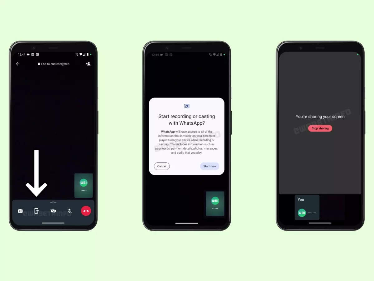 നിങ്ങളുടെ മൊബൈൽ ഫോൺ സ്ക്രീൻ ഇനി വാട്സാപ് വിഡിയോ കോളിലൂടെ തത്സമയം മറ്റുള്ളവർക്കു കാണിച്ചുകൊടുക്കാം. ഇതിനായി സ്ക്രീൻ ഷെയറിങ് ഓപ്ഷൻ നിലവിൽ വന്നു. വിഡിയോ കോളിനിടെ ഫോണിലുള്ള പ്രസന്റേഷൻ, വിഡിയോ, ടെക്സ്റ്റ് അടക്കം മറ്റുള്ളവർക്കു കാണിച്ചുകൊടുക്കാമെന്നതാണു മെച്ചം. സ്ക്രീൻ ഷെയറിങ് വഴി മറ്റൊരാളുടെ സ്ക്രീൻ കാണാൻ മാത്രമേ കഴിയൂ, ഫോണിന്മേലുള്ള നിയന്ത്രണം ലഭിക്കില്ല.